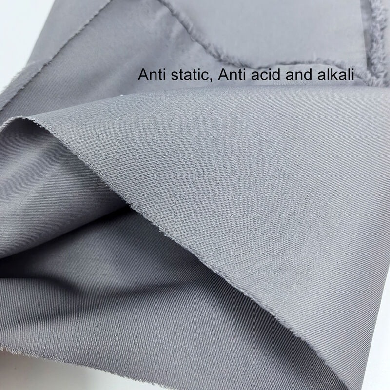 Anti-statische und säurebeständige 5mm-Glasfaser kombiniert 98% Polyester + 2% Kohlenstofffaserstruktur (150D*300D, 210g/m2) mit 5mm leitfähigen Kohlenstoffmaschen.Es bietet einen zuverlässigen antistatischen Index von 10e6-10e8 ΩGleichzeitig wird das Gewebe mit Säure- und Alkalibeständigkeit behandelt.so dass sich die Flüssigkeit auf der Oberfläche des Gewebes wie Tropfen bilden kann (wie Wassertropfen auf Lotusblättern), anstatt sofort in das Gewebe einzudringen., wodurch wertvolle Zeit für die Evakuierung oder Entkleidung gewonnen wird und schwere Verbrennungen der Haut durch starke Säuren und Alkalien vermieden werden.Ein lebensrettendes Hindernis der "verzögerten Penetration" in den menschlichen Körper in einer chemischen BedrohungDieses Gewebe ist in Standardfarben Orange, Blau, Grau oder vollständig anpassbar und ist die bevorzugte Wahl für industrielle Arbeitskleidung, Arbeitskleidung und Schutzkleidung in Chemie, Petrochemie,und brennbare Staubumgebungen.